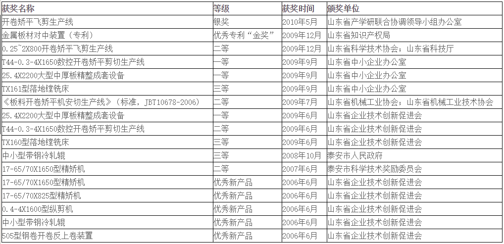“T44-5~25.4×2200開卷矯平移動剪切生產線”入選“2010年度中國國內首臺套技術裝備示范項目”,“大型數控中厚板精整成套設備產業化項目”被列入2011年山東省自主創新成果轉化重大專項計劃;